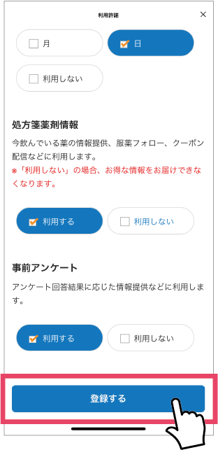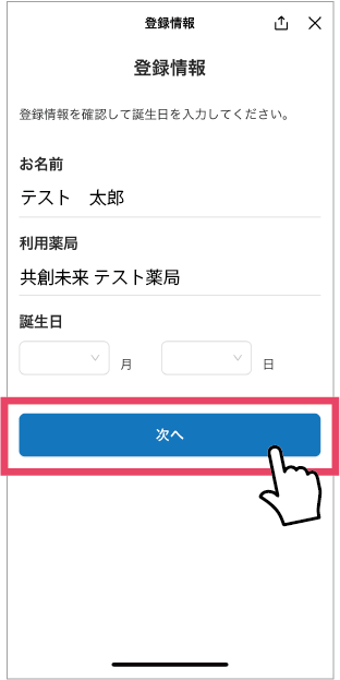 名前、利用薬局を確認し、誕生日を登録します。